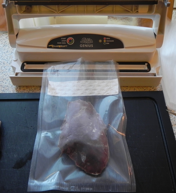 2. Das Fleisch wird in den Beutel gelegt und ein Streifen Flüssigkeitsstopp mit etwas Abstand vor die Nahtstelle platziert.